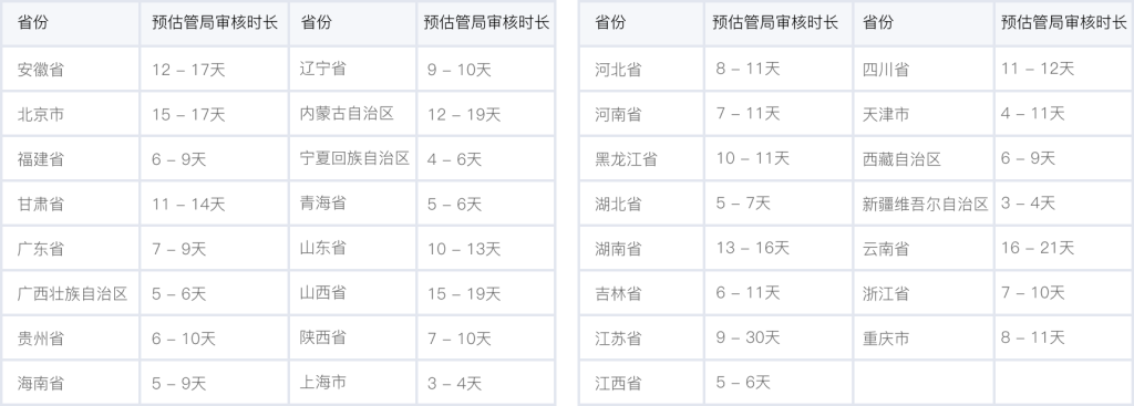 各個省管局預(yù)計審核時長,實際審核時長會根據(jù)備案場景有所不同,下表格僅供參考。詳情可查看 詳細規(guī)則。